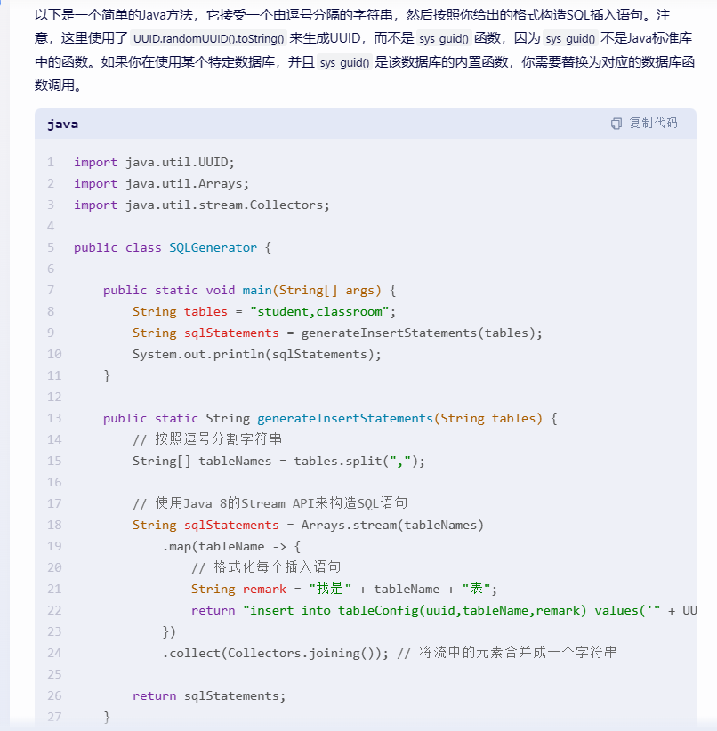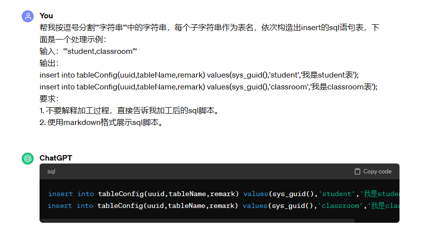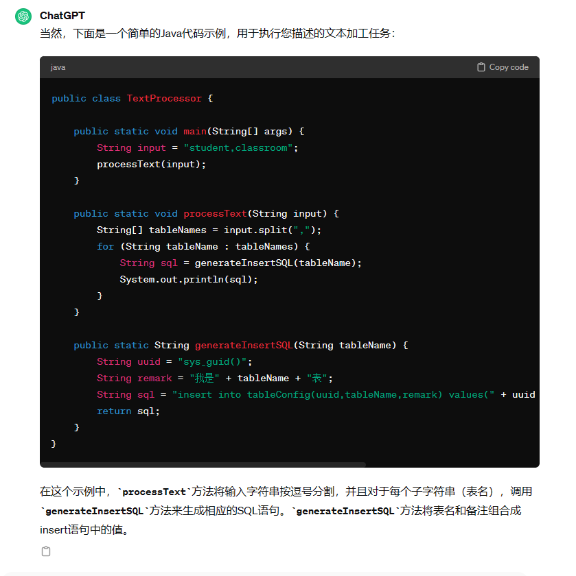 | 帮我写一段加工文本的Java代码,按逗号分割'字符串',每个子字符串作为表名,依次构造出insert的sql语句表,下面是一个处理示例: