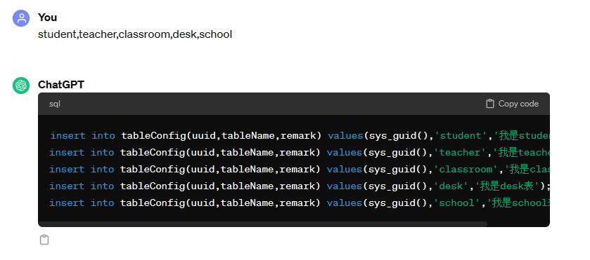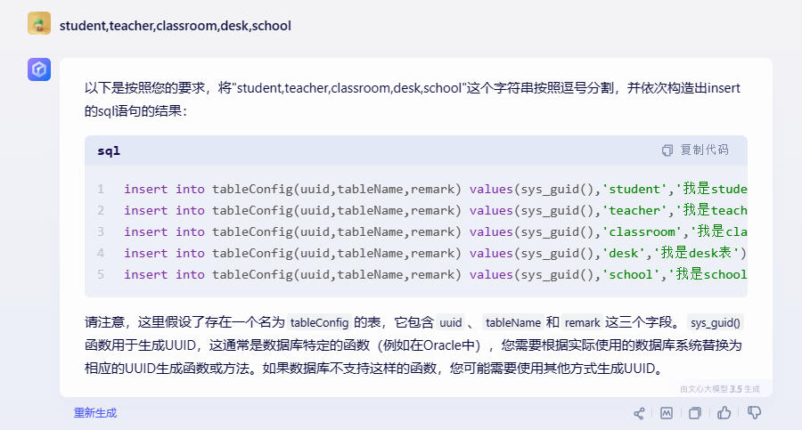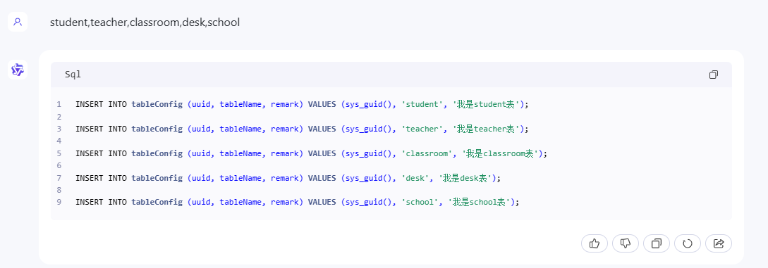 insert into tableConfig(uuid,tableName,remark) values(sys_guid(),'student','我是student表');