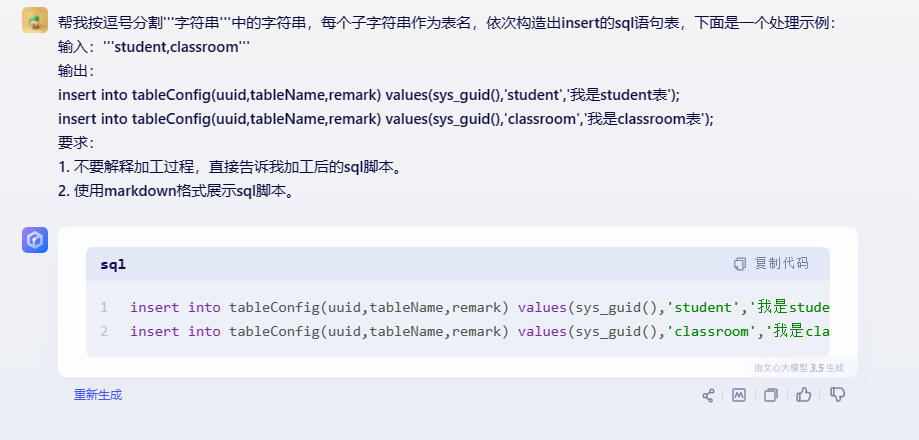 2. 使用markdown格式展示sql脚本;一行一条脚本,脚本之间不要换行。 -- 针对通义千问输出脚本之间喜欢空行的改进。