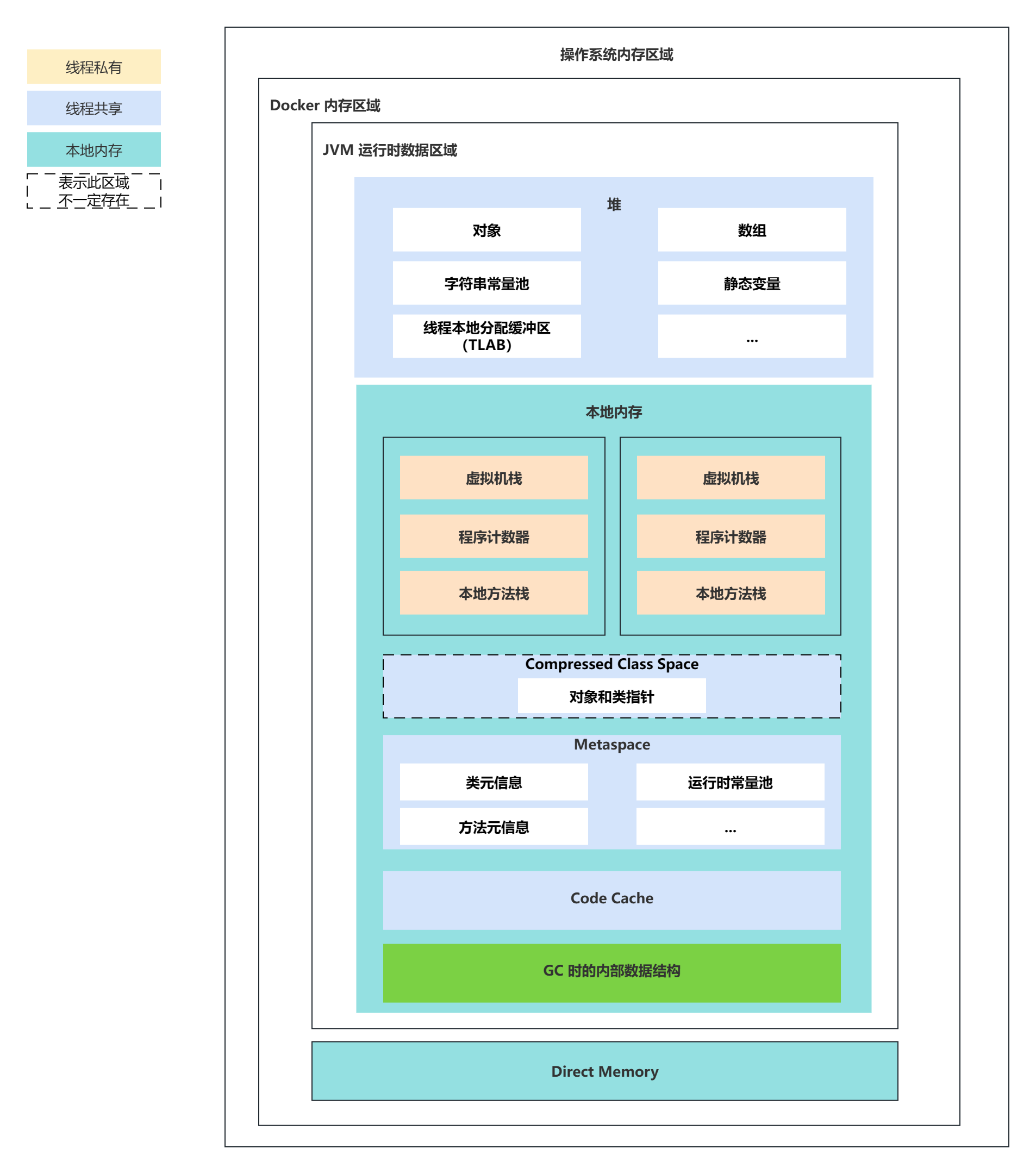- 合理设置操作系统中各 Docker 实例的内存上限是前提,在此前提下才能合理设置好 JVM 相关内存分配参数。